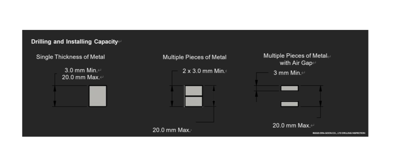 This chart shows the thickness of steel plates that the screw can penetrate and the corresponding drilling methods.